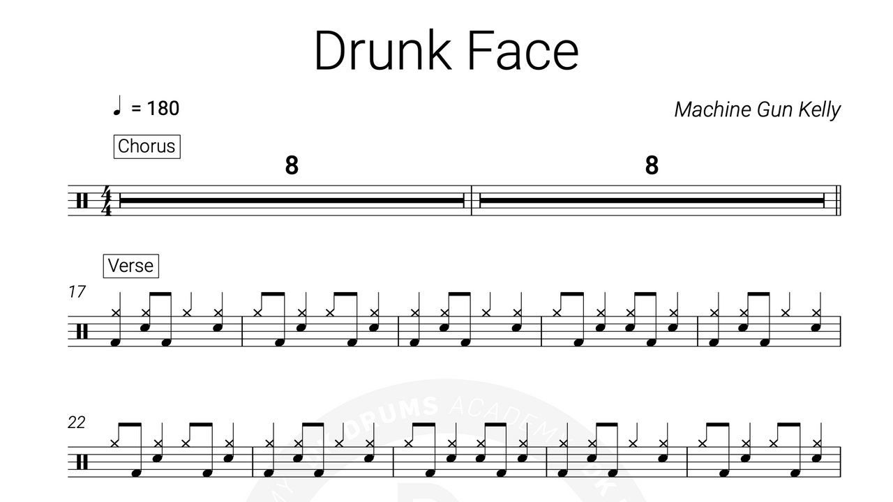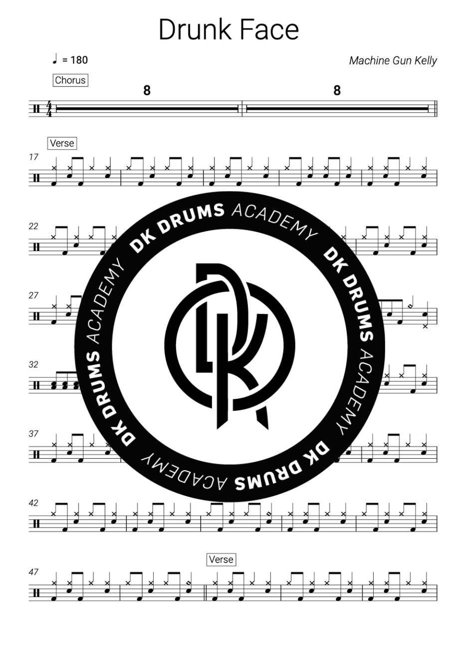 The full drum sheet music for “Drunk Face” by Machine Gun Kelly from the album Tickets To My Downfall (2020).