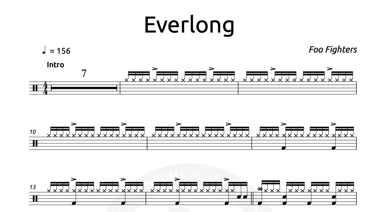 The full drum sheet music for “Everlong” by Foo Fighters from the album The Colour and the Shape (1997).