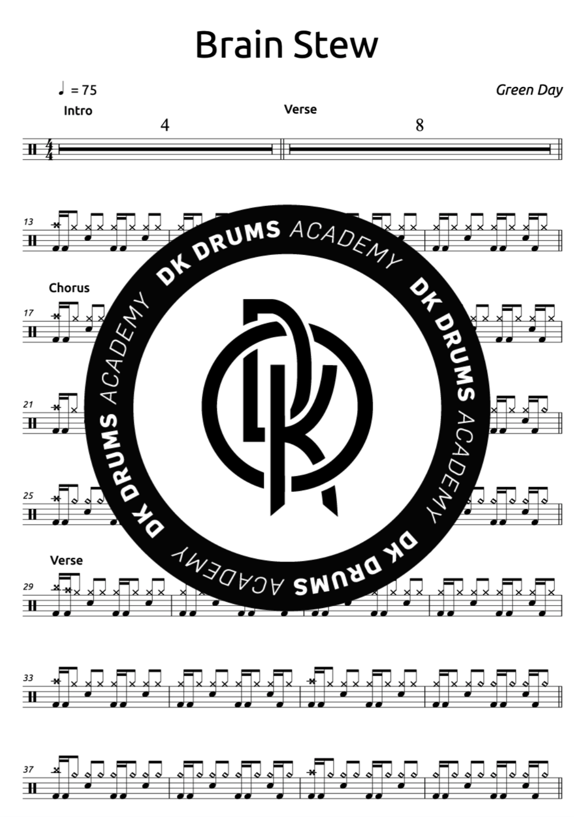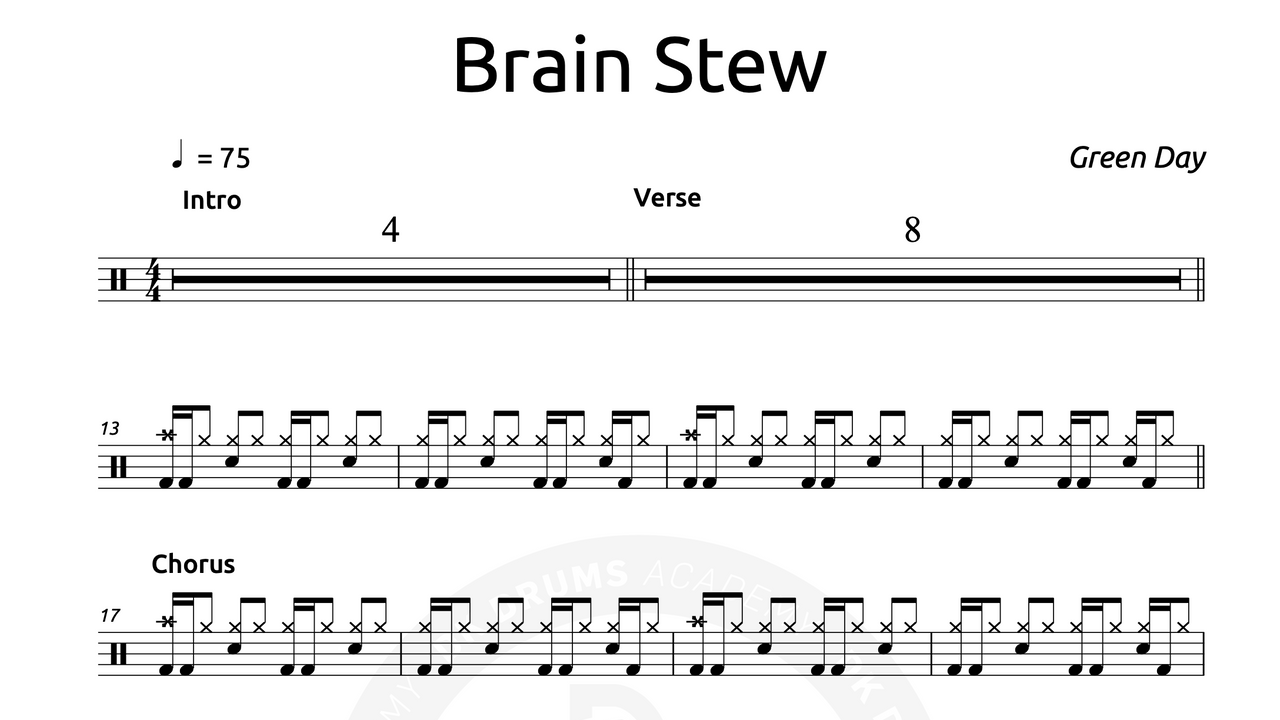 The full drum sheet music for “Brain Stew" by Greenday from the album Insomniac (1995).