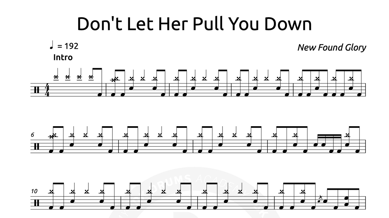 The full drum sheet music for “Don't Let Her Pull You Down" by New Found Glory from the album Not Without A Fight (2009).