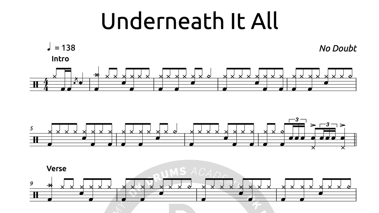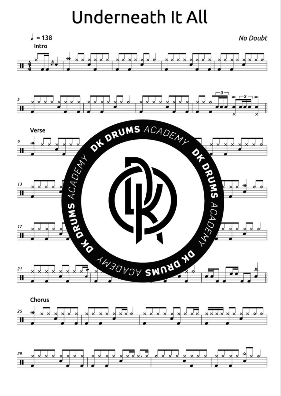The full drum sheet music for “Underneath It All" by No Doubt from the album Rock Steady (2001).
